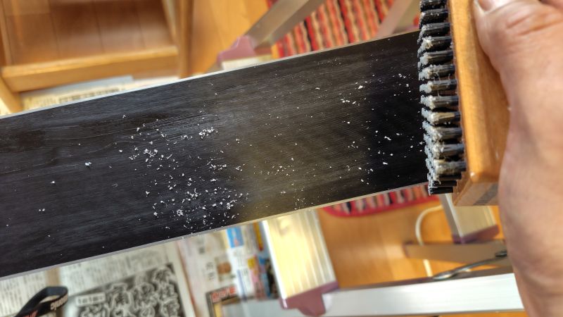 ブラッシングで細かいカスを取り、コルクで擦り込み、フェルトで磨いていくと、しっとりしていて艶々な滑走面に仕上がりました。
